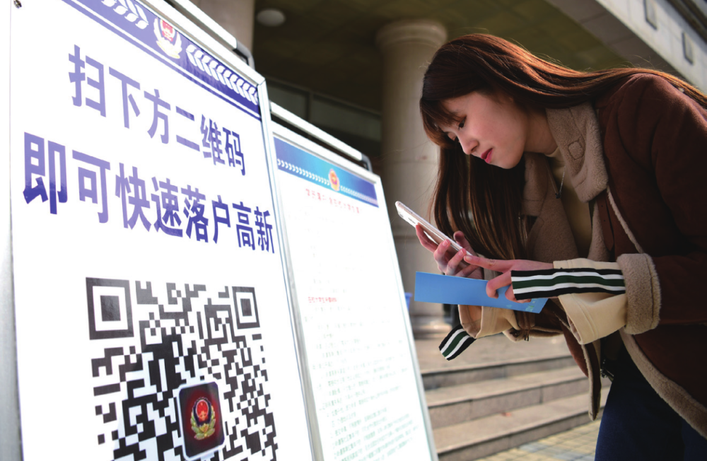 西安高校学生在扫描“西安高新户籍”微信公众号的二维码(邵瑞/摄)