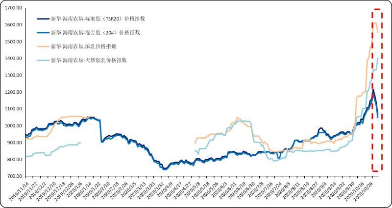 新华·海南农垦-天然橡胶系列价格指数显示,截至11月2日,标准胶(TSR20)价格指数报1060.66点,较10月26日(下同)下跌7.49%;混合胶(20#)价格指数报1048.12点,下跌6.53%。新华·海南农垦-浓乳价格指数报1553.98点,上涨5.92%;新华·海南农垦-天然胶乳价格指数报1402.08点,上涨11.25%。