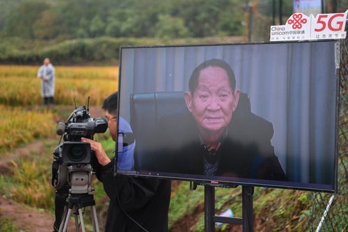 11月2日,袁隆平院士在位于长沙的湖南杂交水稻研究中心与测产现场进行视频连线。新华社记者 陈泽国 摄