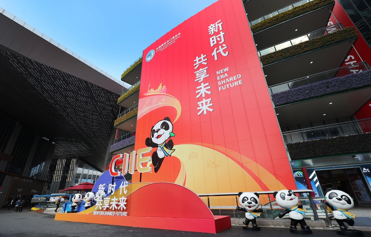 ↑国家会展中心(上海)内布置的熊猫“进宝”主题装饰(11月2日摄)。新华社记者 方喆 摄
