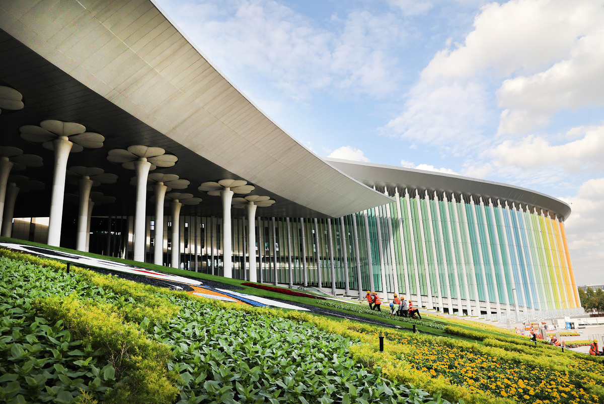 ↑10月14日,园林工人在国家会展中心(上海)南广场进博会鲜花装饰草坪上施工。新华社记者 方喆 摄