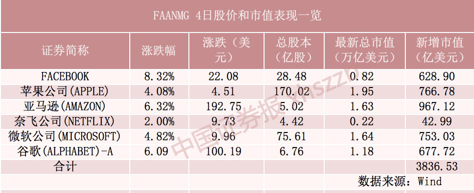 当地时间11月4日,美股大幅走高,科技股领涨,道指盘中一度站上28000点,FAANMG(Facebook、苹果、亚马逊、奈飞、微软、谷歌)日内市值合计新增3836.53亿美元,约合人民币2.55万亿元。