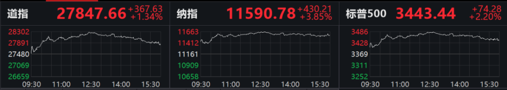 当地时间11月4日,美股三大指数高开高走。据Wind数据,截至收盘,道指上涨1.34%报27847.66点,标普500指数上涨2.2%报3443.44点,纳指上涨3.85%报11590.78点。