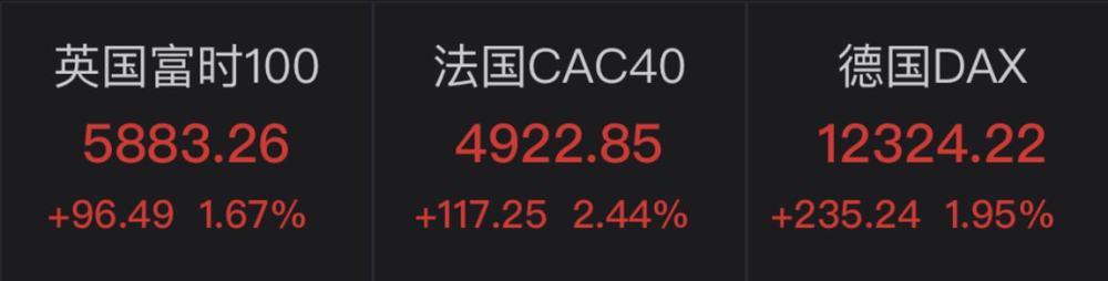 欧洲股市则低开高走,收盘时全线上涨。据Wind数据,德国DAX指数涨1.95%,报12324.22点;法国CAC40指数涨2.44%,报4922.85点;英国富时100指数涨1.67%,报5883.26点。