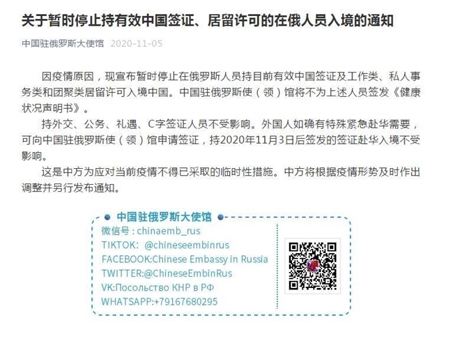 中国驻俄罗斯大使馆微信公众号11月5日发布《关于暂时停止持有效中国签证、居留许可的在俄人员入境的通知》。
