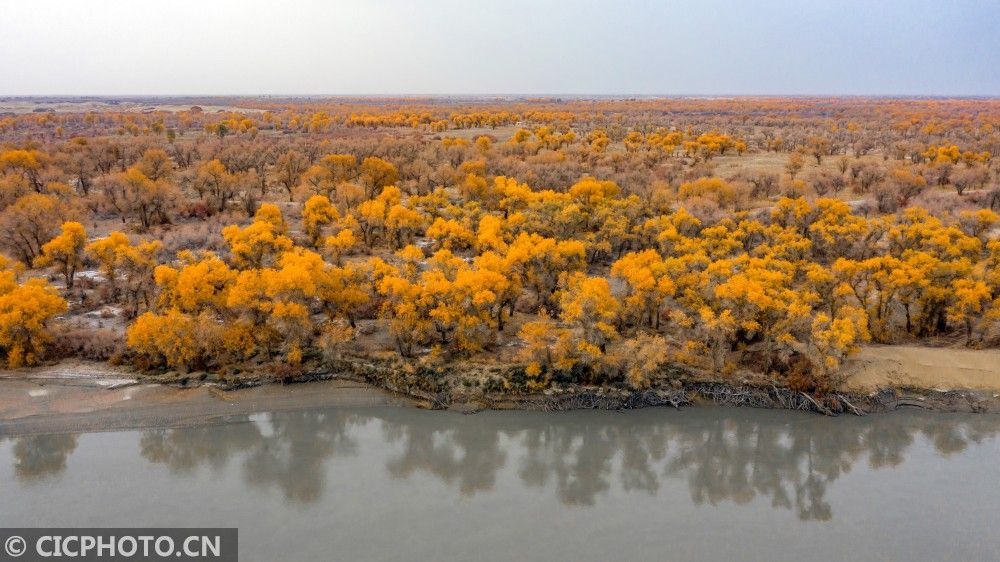 ↑2020年10月29日在新疆巴音郭楞蒙古自治州尉犁县喀尔曲尕乡拍摄的塔里木河与胡杨林。CICPHOTO/李飞 摄