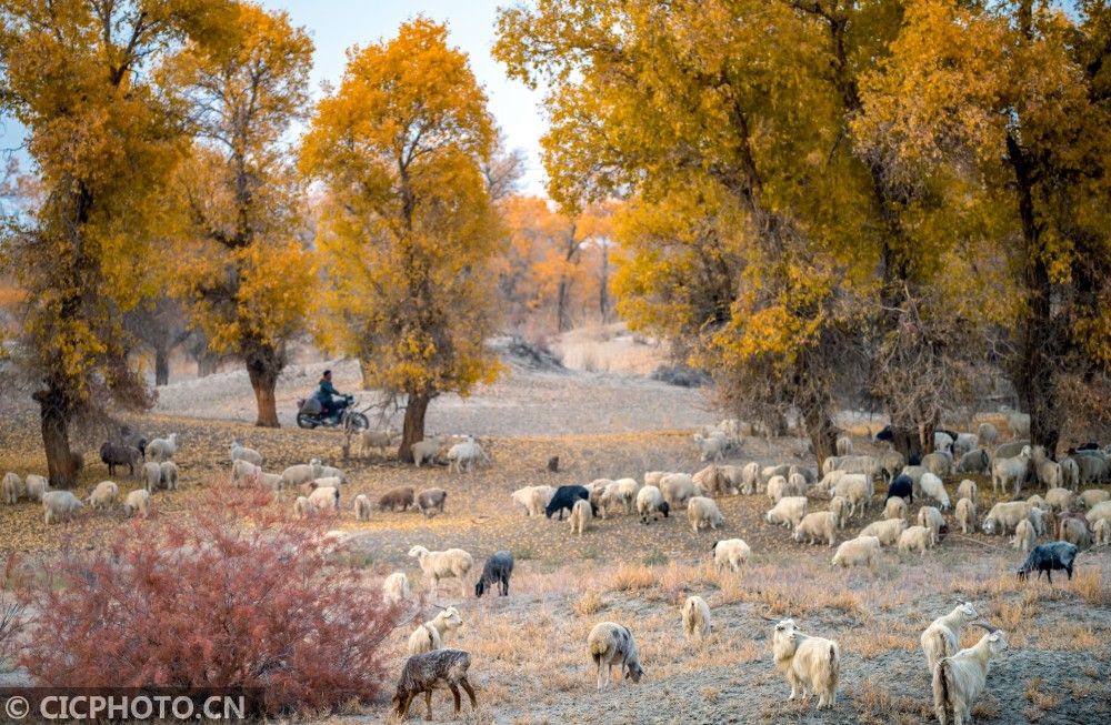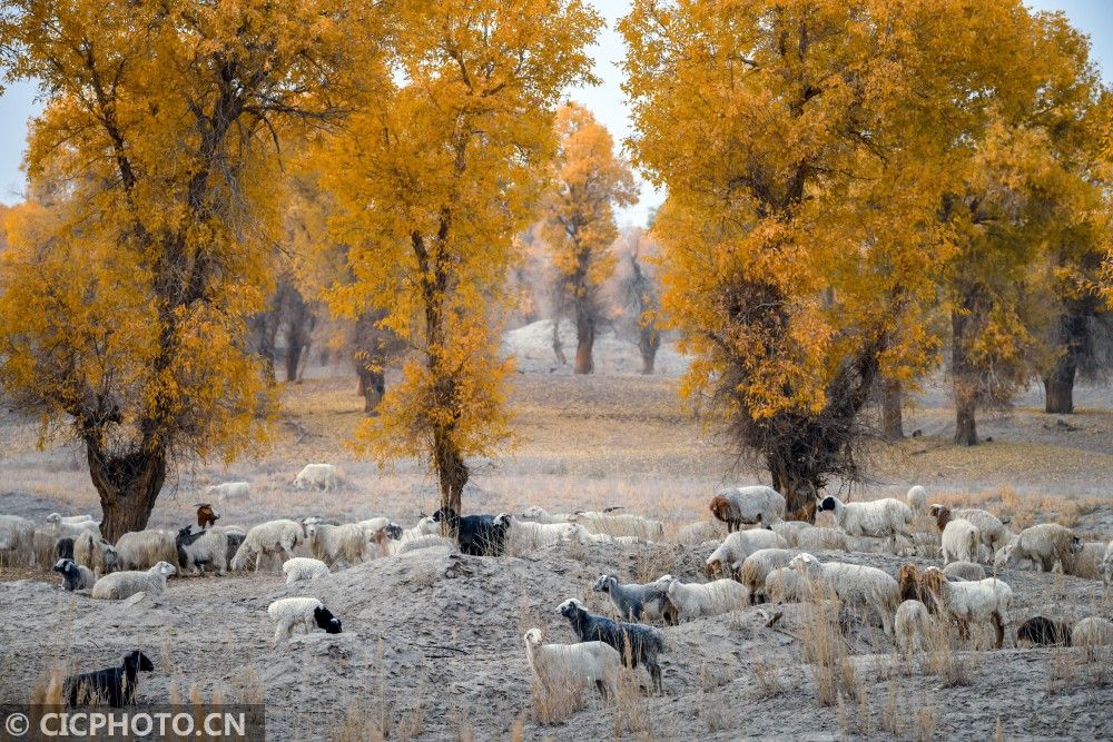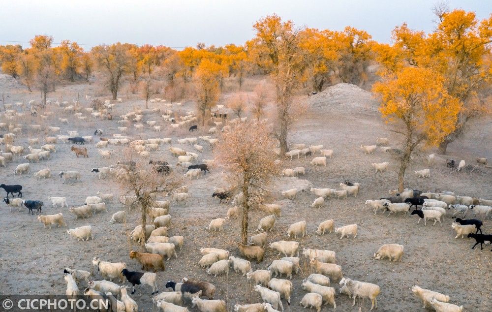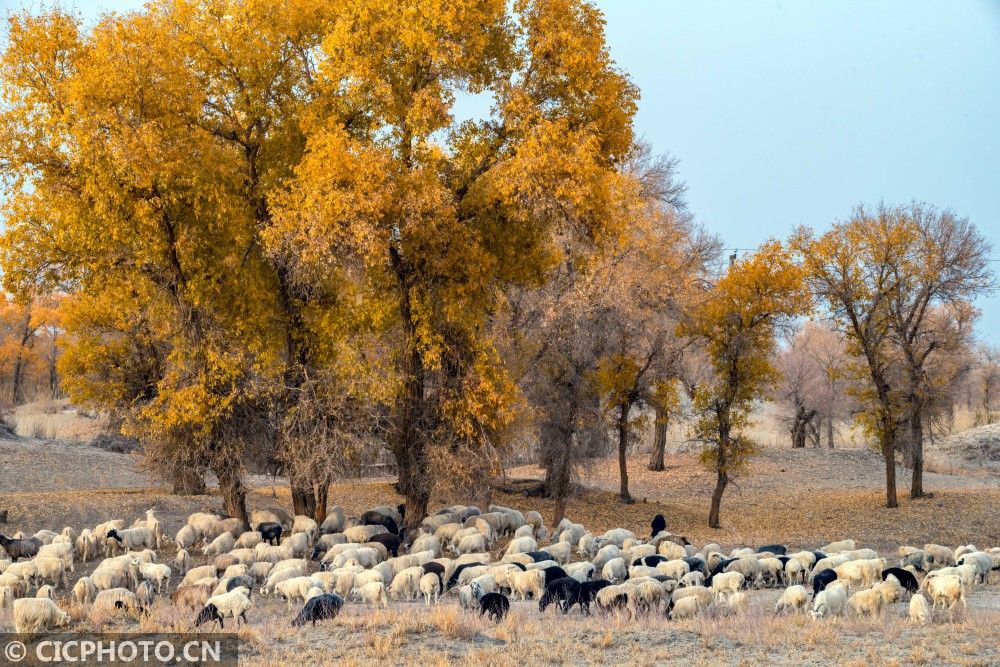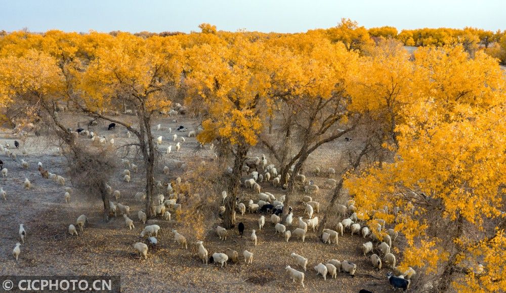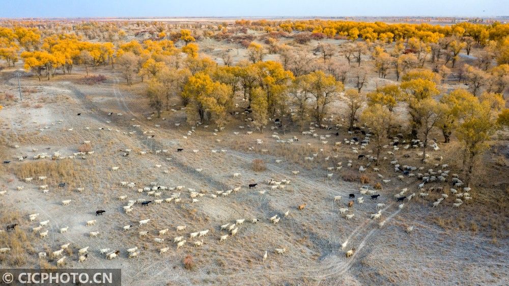 ↑2020年10月29日,新疆巴音郭楞蒙古自治州尉犁县喀尔曲尕乡,放牧的羊群在胡杨林间觅食。CICPHOTO/李飞 摄