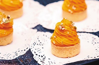 3.南瓜泥塞入裱花袋,挤到挞壳中,切碎些许南瓜籽用以装饰点缀。