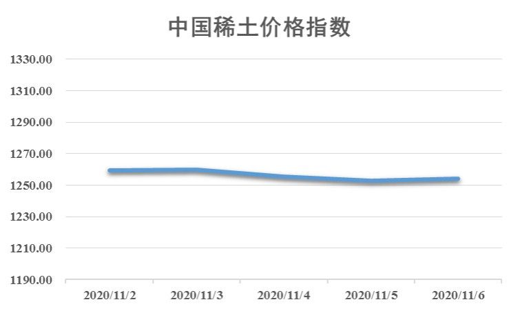 新华财经北京11月6日电(刘星麟)本周稀土市场整体偏弱运行,中国稀土价格指数小幅下调,截至11月6日,中国稀土价格指数报1254.07点,较上周五(10月30日)下跌1.59点,跌幅0.13%。