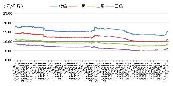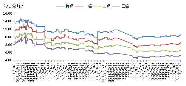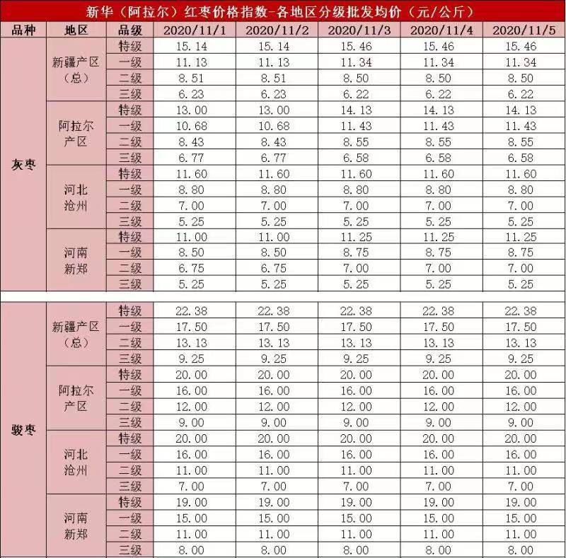 新疆产区方面,截至11月5日,各等级骏枣价格每公斤出货均价上涨皆超过1.00元,其中特级、一级骏枣价格上涨最多,每公斤出货均价上涨1.60元;各等级灰枣价格也呈现上涨走势,其中特级、一级灰枣每公斤出货均价上涨最多,为0.87元和0.66元。目前,新疆产区不同地区新枣上市情况不一,阿克苏、阿拉尔地区新枣下树较多、加工规模较大,客商采购积极,带动新枣价格持续上涨。未来短期,产区将有更多地区红枣企业参与到新枣销售,红枣售价或将继续上行。