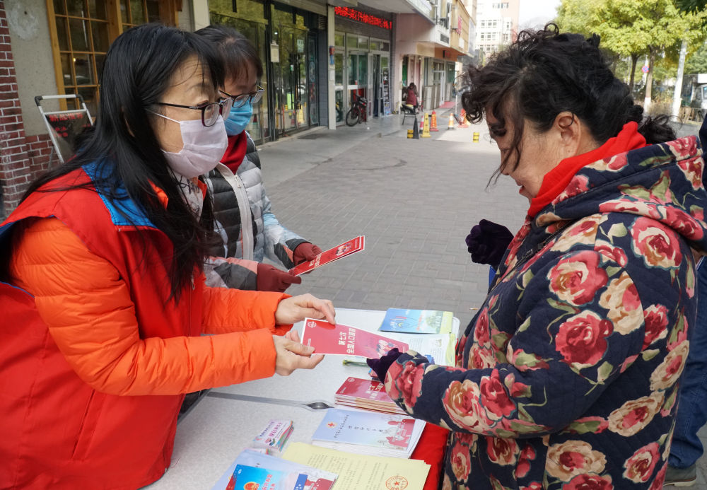 尽管天气寒冷,社区工作人员热情不减,小小的办公桌上摆放着各种宣传册、便民服务卡、辖区居民老年证、业务办理登记表……过路群众纷纷驻足,前来咨询,四名工作人员耐心地答疑解惑。