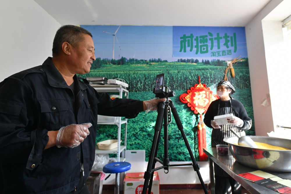 11月2日,山东省济南市平阴县的普通农民刘传东(左)、刘心春夫妇在家中直播。 新华社记者 朱峥 摄