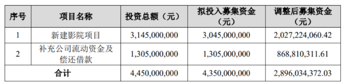 新建影院项目拟投入募集资金由30.45亿元调整为20.27亿元,补充公司流动资金及偿还借款拟投入募集资金由13.05亿元降至8.69亿元。
