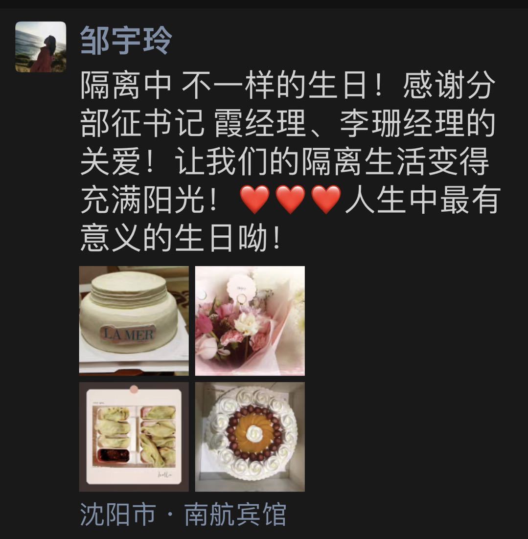 当天,南航北方分公司委托客舱部为邹宇玲送去了生日蛋糕、鲜花和热腾腾的饺子,生日的祝福也是不可少的,这让隔离中的邹宇玲心里暖暖的。
