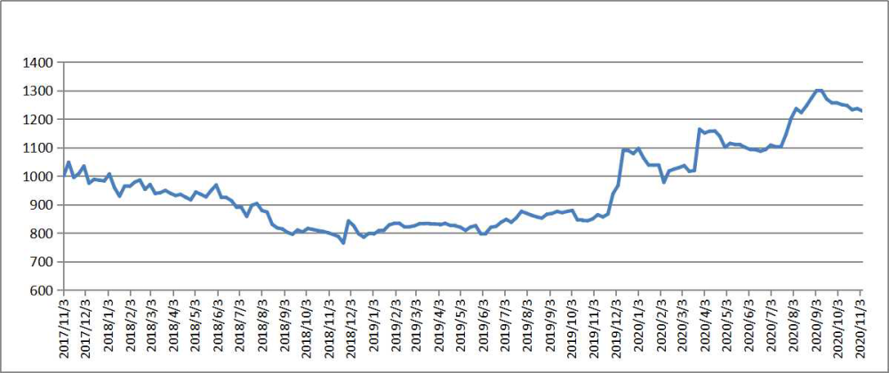 11月6日,指数报1228.22点,较上期(2020.10.26-11.1,下同)下跌8.19点,跌幅0.66%,与基期相比上涨228.22点,涨幅22.82%。