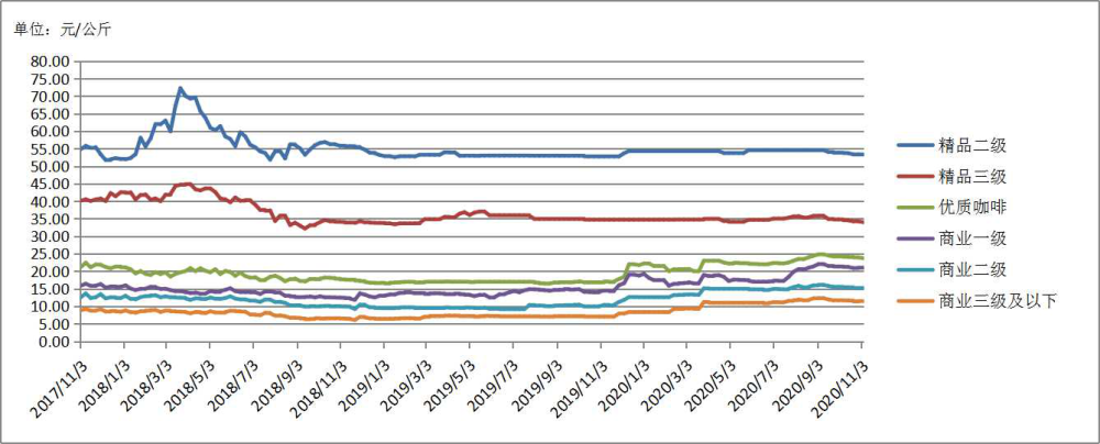 具体来看,精品二级咖啡豆均价报53.25元/公斤,较上期下跌0.10元/公斤,跌幅0.19%;精品三级咖啡豆均价报34.00元/公斤,较上期下跌0.25元/公斤,跌幅0.73%;优质咖啡豆均价报23.71元/公斤,较上期下跌0.24元/公斤,跌幅1.00%;商业一级咖啡豆均价报20.90元/公斤,较上期下跌0.10元/公斤,跌幅0.48%;商业二级咖啡豆均价报15.13元/公斤,较上期下跌0.09元/公斤,跌幅0.59%;商业三级及以下咖啡豆均价报11.35元/公斤,较上期下跌0.12元/公斤,跌幅1.05%。