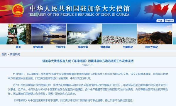 中新网11月11日电 据中国驻加拿大大使馆网站消息,11月10日,《环球邮报》发表题为“加拿大安全情报局警告中国的‘猎狐行动’将加华人社区作为目标”的文章。该文无视基本事实,别有用心地对中方开展国际追逃追赃、打击跨国犯罪等进行污蔑抹黑,中方对此坚决反对。