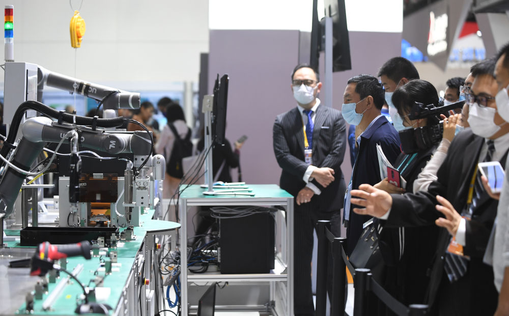 11月6日,在第三届进博会技术装备展区,人们在西门子展台观看人机协作的智能化单元生产线。 新华社记者 李任滋 摄