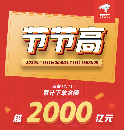 根据京东提供的数据,11月1日00:00至11月11日00:09,“京东11.11全球热爱季”累计下单金额突破2000亿元,再一次创造纪录。