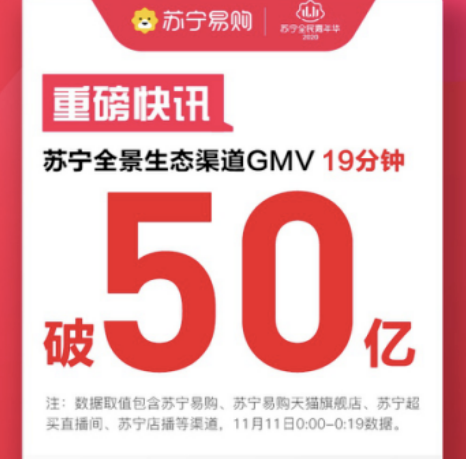 根据苏宁提供的数据,11日0点“双11”全面开启后,仅用时19分钟,苏宁全场景生态渠道(包含苏宁易购、苏宁易购天猫旗舰店、苏宁易购超级买手直播间、苏宁店播)GMV破50亿。