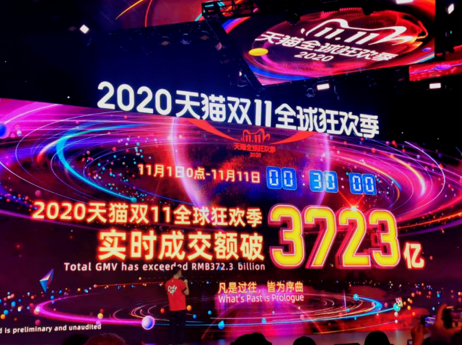 根据天猫“双11”数据显示,11月1日至11日0点30分,2020年天猫“双11”全球狂欢季实时成交额突破372300000000元!