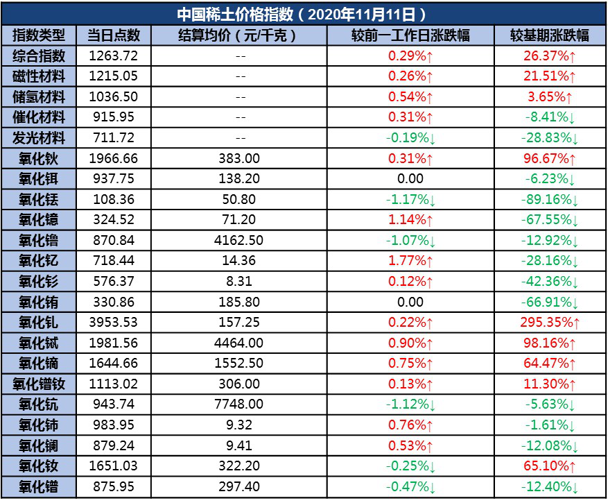 其中,氧化钬、氧化镱、氧化钇、氧化钐、氧化钆、氧化铽、氧化镝、氧化镨钕、氧化铈、氧化镧单品价格指数分别较前一工作日上涨;氧化铥、氧化镥、氧化钪、氧化钕、氧化镨单品价格指数分别较前一工作日下跌;氧化铒、氧化铕单品价格指数分别与前一工作日持平。