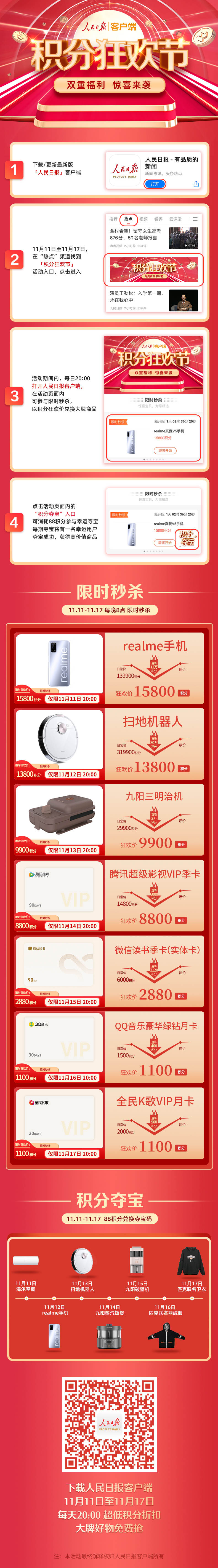活动期间,每天晚8点打开人民日报客户端,在“热点”频道找到积分狂欢节活动入口,即可消耗积分免费兑换超值特惠商品,还有机会参与积分夺宝,抽取幸运奖品,数量有限,先到先得,快来参与吧!