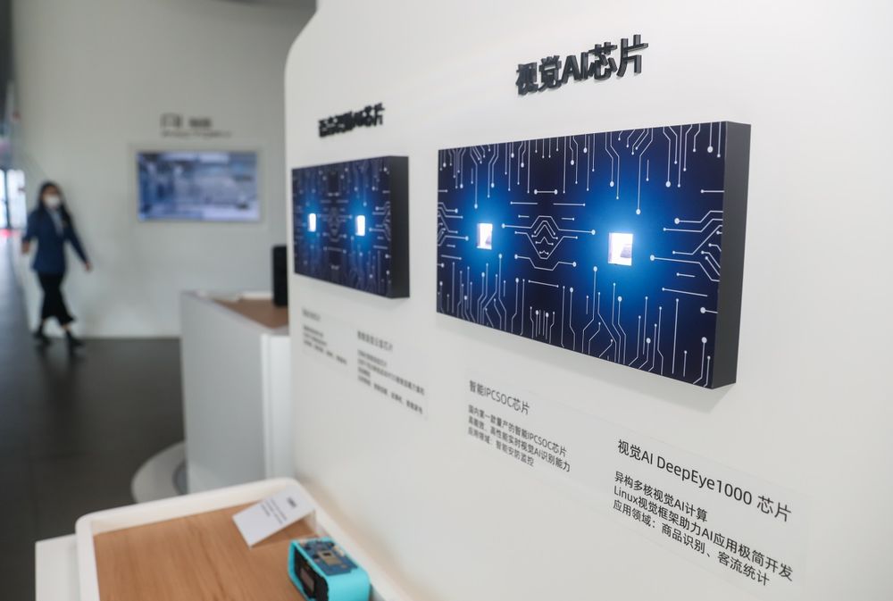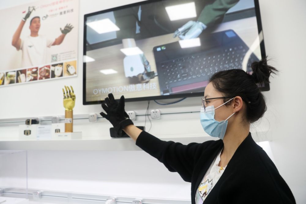2020年,在上海张江人工智能岛,工作人员展示“智能神经仿生手”。