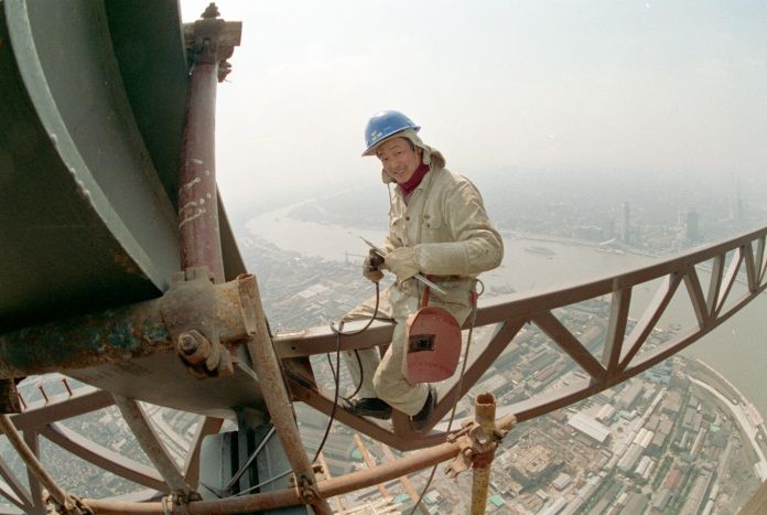 一名年轻的电焊工在离地300米的高空建设“东方明珠”,他身下是正在建设中的浦东新区。