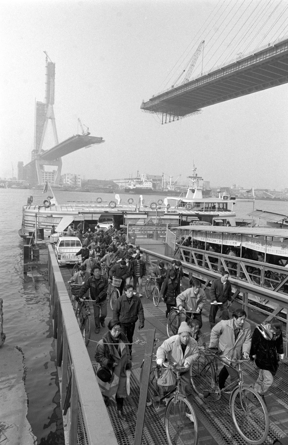 1993年,市民走下一艘轮渡。他们身后的杨浦大桥于同年10月建成通车。