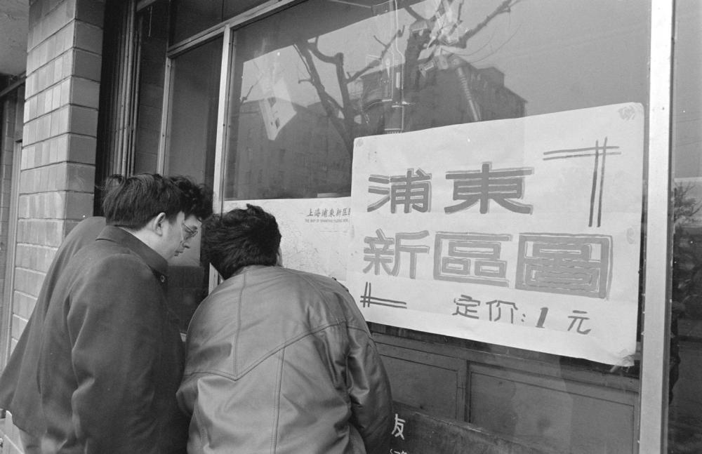 1990年,开发开放上海浦东的决定公布,明天的浦东将是什么样?街头巷尾的浦东新区图吸引市民。