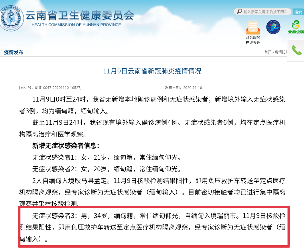 据云南省瑞丽市疫情防控工作指挥部消息,11月9日,瑞丽市新增1例境外输入新冠肺炎无症状感染者(缅甸输入)及1例关联无症状感染者。疫情发生后,瑞丽市立即启动应急响应,迅速开展流行病学调查、密切接触者追踪和核酸检测。