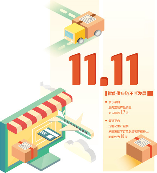 在天猫,服装商家“初棉”与新制造平台犀牛智造工厂联合推出带生产日期的衣服,从商家接下订单到顾客穿在身上,时间约为10天。“以前大促时,要提前两个月备货,一旦没把握准消费趋势,很容易滞销。”初棉相关负责人说,在大数据驱动、快速反应的柔性制造模式下,商家无须提前备货,可以根据“双11”预售情况,在犀牛工厂下单,即卖即产,最大程度降低生产成本,提高商家周转效率。