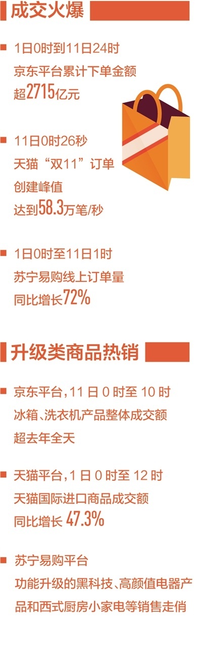 今年“双11”,升级类商品热销、服务类消费快速增长。在京东平台,海尔、美的、格力、华为等主流3C家电品牌成交额都以“秒”速过亿元。11日0时至10时,冰箱、洗衣机产品整体成交额超去年全天。小米手机成交额同比增长超3倍,华为、三星手机成交额同比增长120%。11日前3分钟,电脑销量超10万台;前10分钟,高端RTX系列显卡成交额同比增长6倍。
