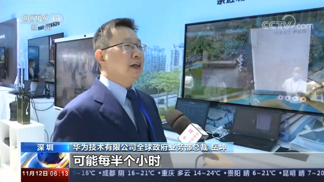 华为技术有限公司全球政府业务部总裁 岳坤:这是在汛期的时候经常看的一个水尺,以前都是通过人看这个水尺,每半个小时、一个小时看一次 ,我们现在就可以通过摄像头去看这个水尺,我们可以把看的时间缩短为一分钟甚至是更短的时间,把人做不到的东西通过机器就实现了。