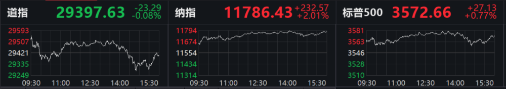 当地时间11月11日,美股三大股指涨跌不一。据Wind数据,道指微跌0.08%,纳指大涨2.01%,标普500指数涨0.77%。