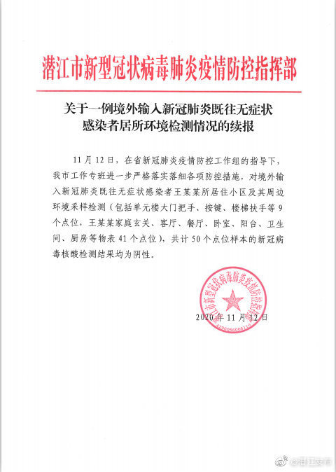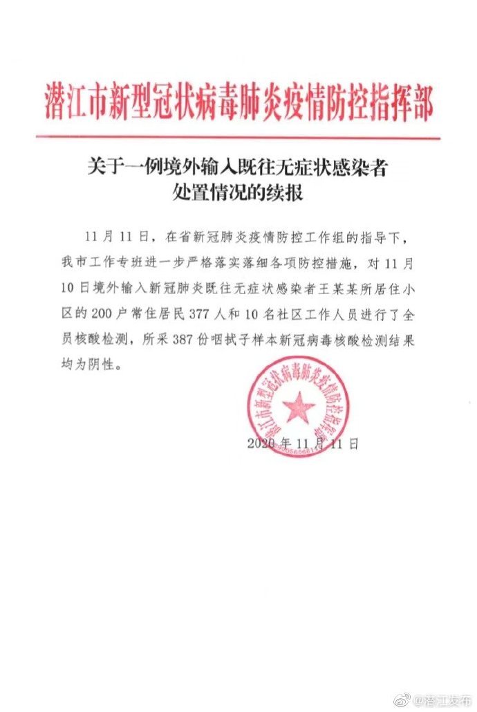 据潜江市新冠肺炎疫情防控指挥部最新消息,11月11日,该市对前一日境外输入新冠肺炎既往无症状感染者王某某所居住小区的200户常住居民377人和10名社区工作人员进行了全员核酸检测,所采387分咽拭子样本新冠病毒核酸检测结果均为阴性。
