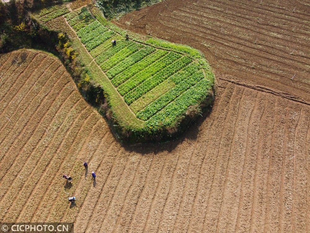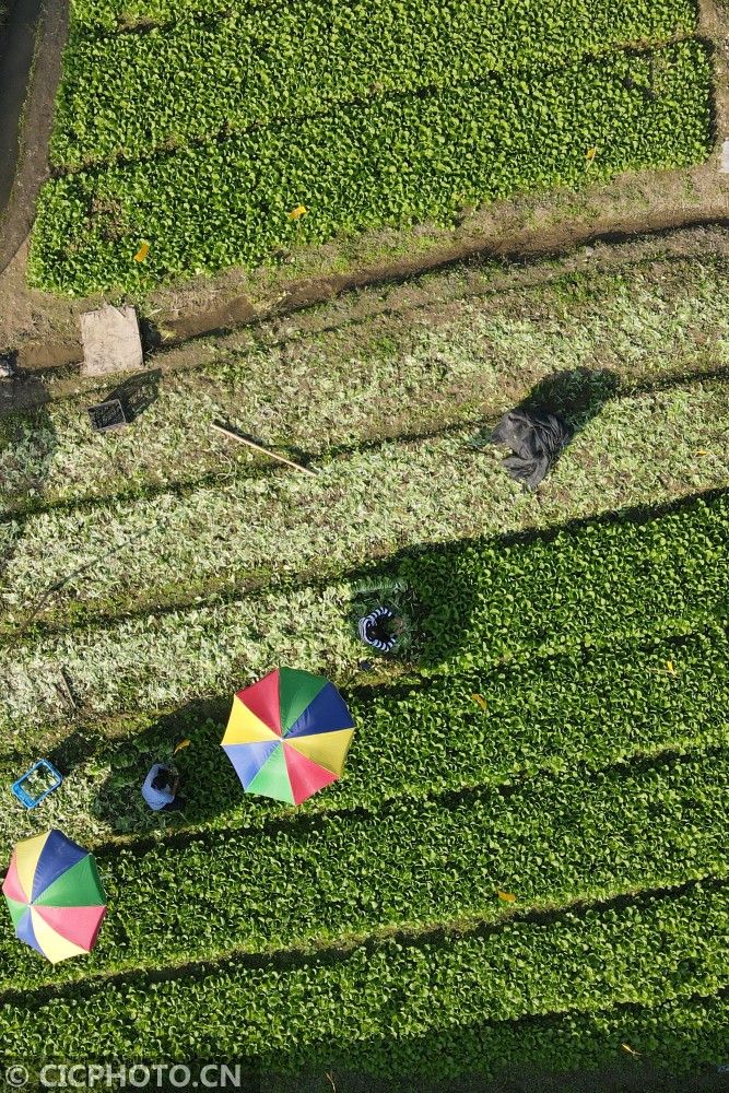 ↑2020年11月7日,湖南省湘西土家族苗族自治州吉首市乾州街道西门口村,农民在田间收获小白菜。(无人机拍摄)CICPHOTO/刘振军 摄