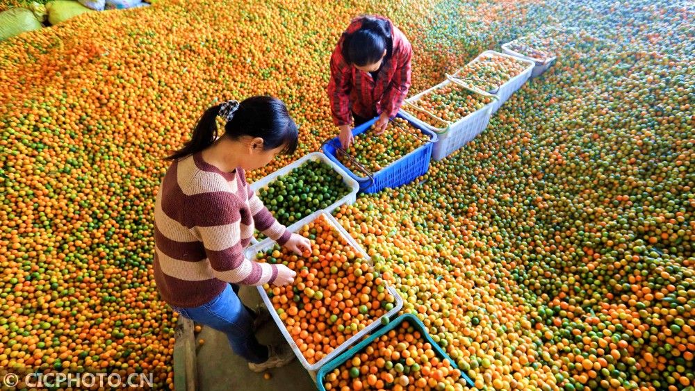 ↑2020年11月8日,广西壮族自治区柳州市融安县电商园,农民在分拣金桔,准备外运销售。CICPHOTO/覃庆和 摄