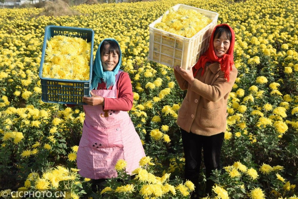 ↑2020年11月8日,江苏省连云港市东海县房山镇双岭村,农民在扶贫创业园里采摘金丝皇菊。CICPHOTO/张正友 摄