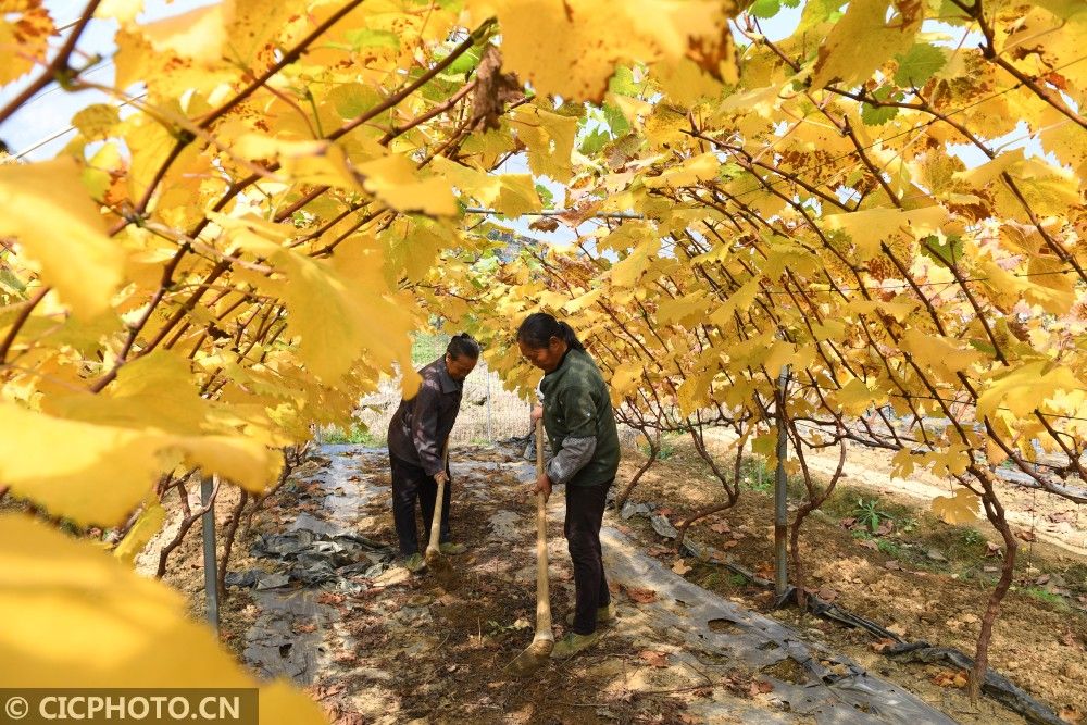 ↑2020年11月8日,贵州省仁怀市鲁班街道隆堡社区葡萄园内,果农在培土、挖沟。CICPHOTO/陈勇 摄