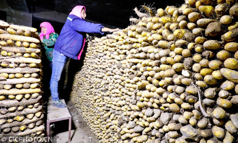 ↑2020年11月7日,甘肃省张掖市一家中药材种植农民专业合作社恒温库内,农民在摆放刚采收的山药。CICPHOTO/王将 摄