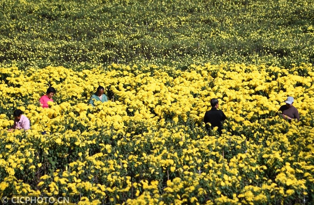 ↑2020年11月7日,湖北省襄阳市保康县黄堡镇大屋场村金丝皇菊种植基地,农民在采摘金丝皇菊。CICPHOTO/陈泉霖 摄