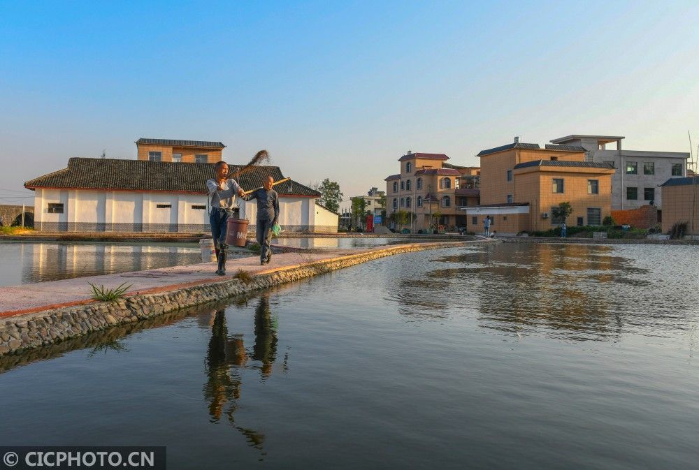 ↑2020年11月7日,湖南省永州市道县清塘镇陈雄村鱼塘边上,农民在投放鱼料。CICPHOTO/蒋克青 摄