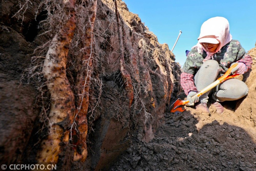 ↑2020年11月7日,甘肃省张掖市甘州区长安镇万家墩村山药种植基地,农民在采挖山药。CICPHOTO/王将 摄