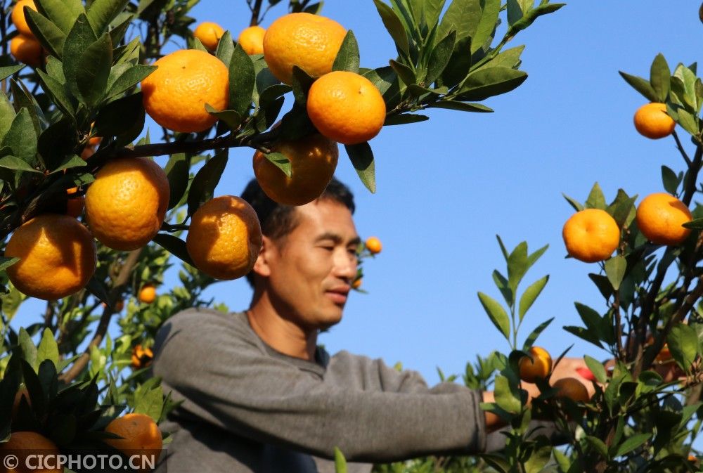 ↑2020年11月7日,湖南省永州市道县万家庄街道长兴村,果农在采收南丰蜜桔。CICPHOTO/周凤连 摄