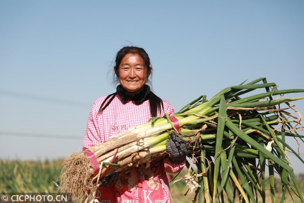 ↑2020年11月9日,河北省邢台市广宗县大平台乡王庄村,农民在整理刚采收的大葱。CICPHOTO/刘素志 摄