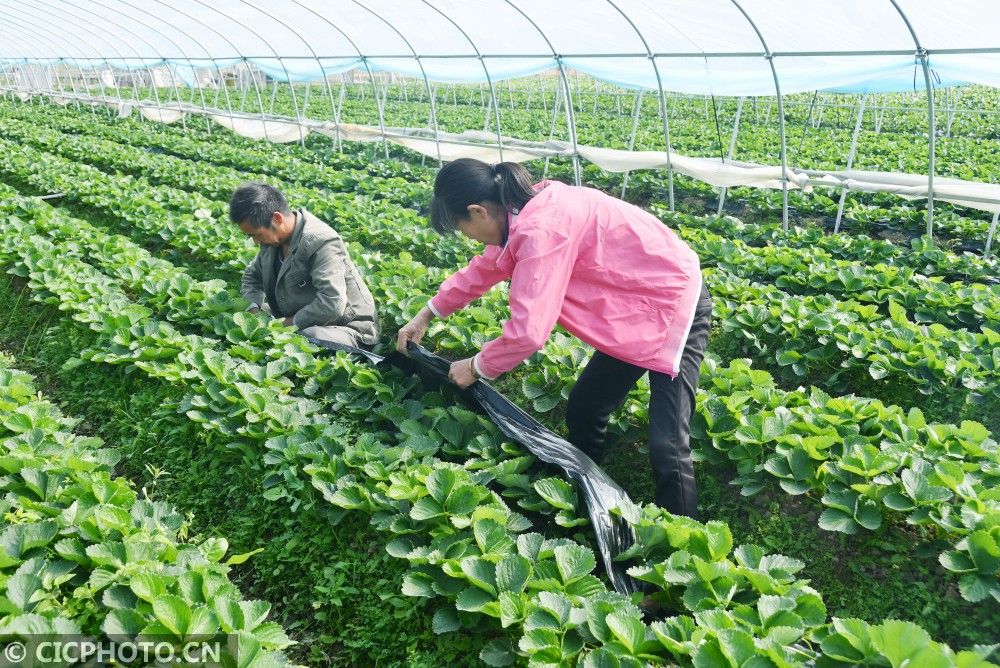 ↑2020年11月7日,湖南省永州市江永县上江圩镇龙田村,农民在给草莓苗覆地膜。CICPHOTO/田如瑞 摄