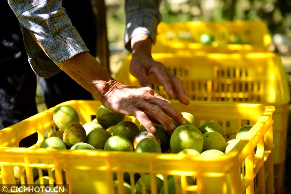↑2020年11月8日,广西壮族自治区桂林市龙胜各族自治县龙脊镇金江村,农民在分拣刚采摘的罗汉果。CICPHOTO/潘志祥 摄