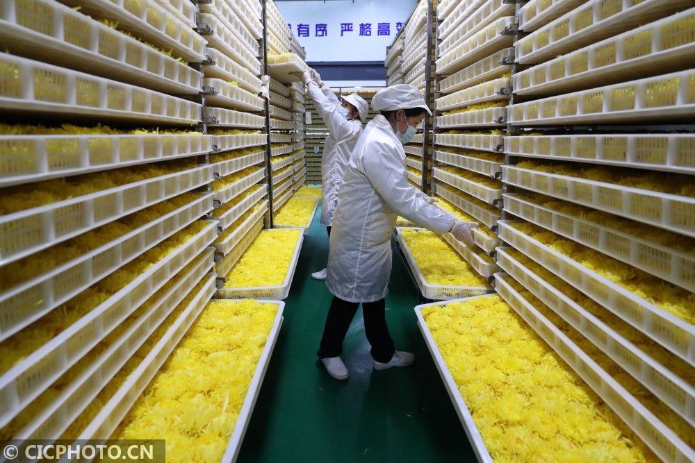 ↑2020年11月7日,湖南省怀化市通道侗族自治县坪坦乡横岭村,农民在菊花加工车间烘干金丝皇菊。CICPHOTO/刘强 摄